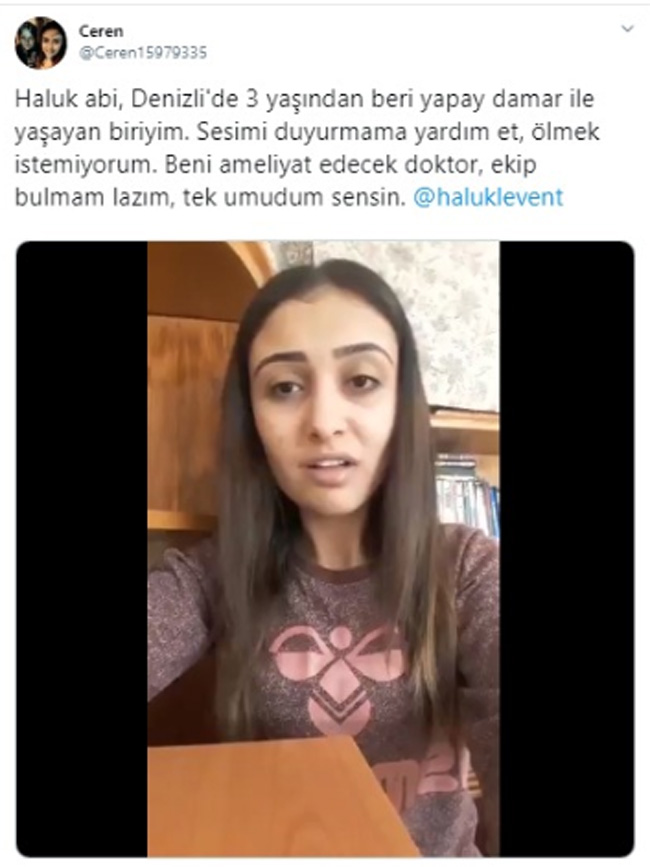 Denizli’de yaşayan 21 yaşındaki Ceren, 3 yaşından beri yapay damar ile yaşadığını ve tedavi için desteğe ihtiyacı olduğunu belirterek sosyal medya hesabından şimdiye kadar birçok kişiye destek olan Anadolu Halk ve Barış Platformu’nun (AHBAP) Başkanı olan şarkıcı Haluk Levent’ten destek istedi.