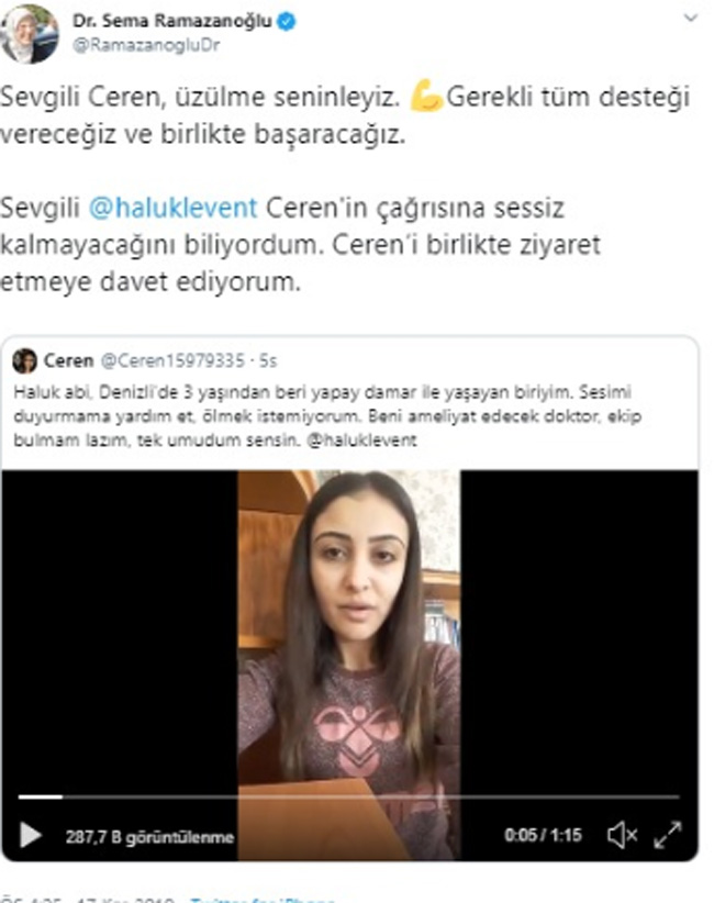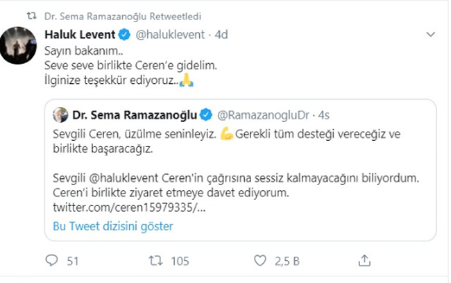 Ceren’in bu talebi, Haluk Levent’ten önce Aile Ve Sosyal Politikalar Eski Bakanı ve eski Denizli Milletvekili Sema Ramazanoğlu’nun dikkatini çekti. Ramazanoğlu, sosyal medya hesabından Haluk Levent’e seslenerek, “Ceren’in birlikte ziyaret edelim” teklifinde bulundu.