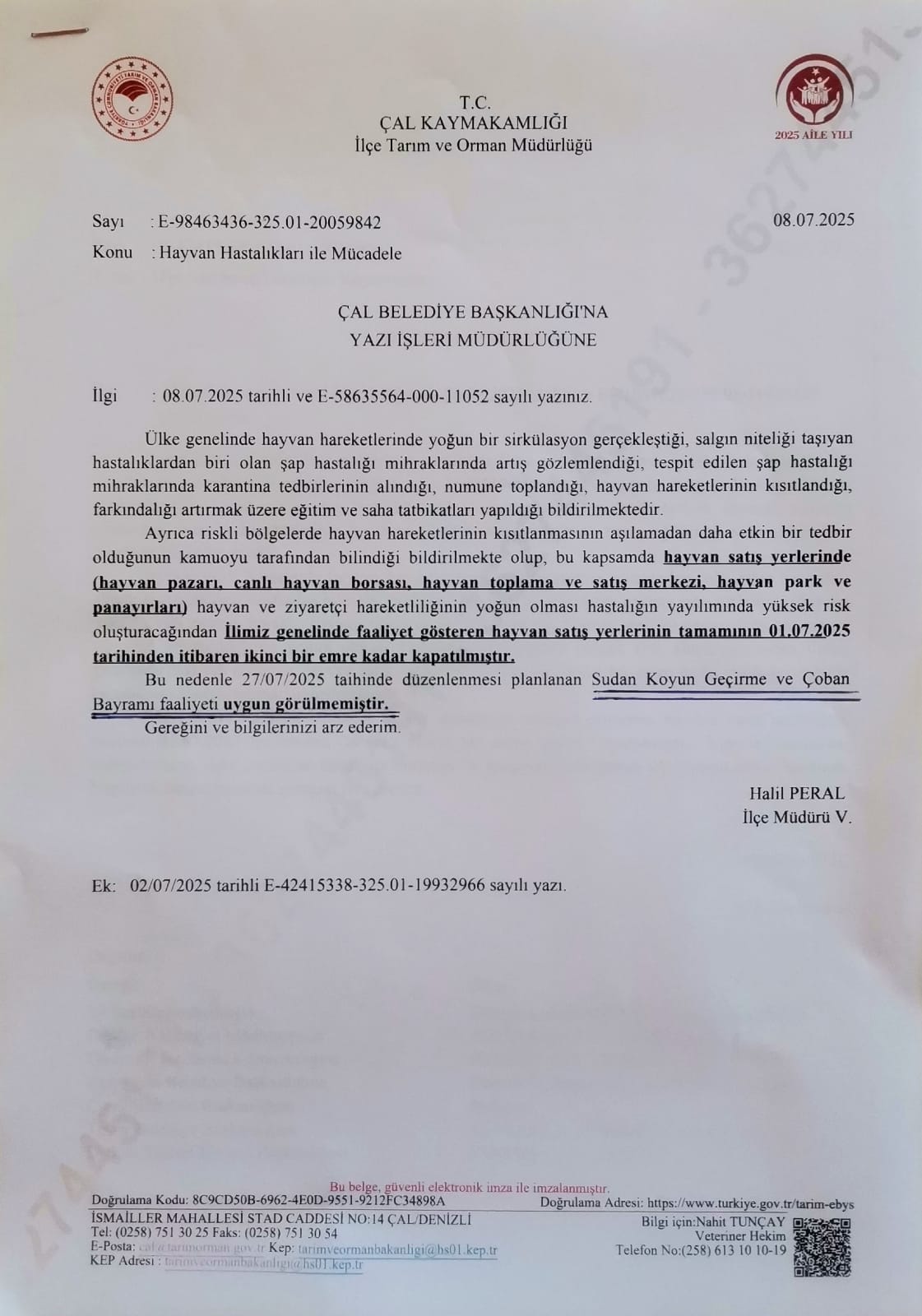 Sadece Çal’ın ya da Aşağıseyit Muhtarlığı’nın bir sorunu olmadığını söyleyen başkan Hakan, "Bu bölgenin toplumsal bir sorunu, toplumsal bir refleks gösterilmesi lazım. İnsanlarımız bu kadim geleneği yaşatmak isteyen, kuşaktan kuşağa aktarmak isteyen insanlarımız tabii ki üzgün, bizler de üzgünüz. Ama biz her ne olursa olsun, 26'sında ve 27'sinde 8 asırlık Sudan Koyun Geçirme ve Çoban Bayramı'nı yapacağız demiştik. ülke genelinde yaşanan şap hastalığından dolayı, İl Tarım ve Orman Müdürlüğü'nden ve Valiliğimizden gelen 1 Temmuz 2025 tarihli ‘tüm hayvan satış yerlerinin ikinci bir emre kadar kapatılması yazısı geldi. Bu yazıya istinaden de, bu nedenle de Çal Kaymakamlığı, İlçe Tarım ve Orman Müdürlüğü'nün hayvan hastalıkları ile mücadele konulu 8 Temmuz 2025 tarihli yazısına istinaden 26-27 Temmuz'da yapacağımız Sudan Koyun Geçirme ve Çoban Bayramı etkinliğimiz iptal ediliyor. Biz de bu iptal ve gerekçelerini Kaymakamlık ve İlçe Tarım’ın bize verdiği resmi yazıyla öğrenmiş olduk. Bu yazıyı önemsiyoruz. Çünkü bizim için insan sağlığı, hayvan sağlığı, çevre sağlığı da önemli" Şeklinde konuştu.