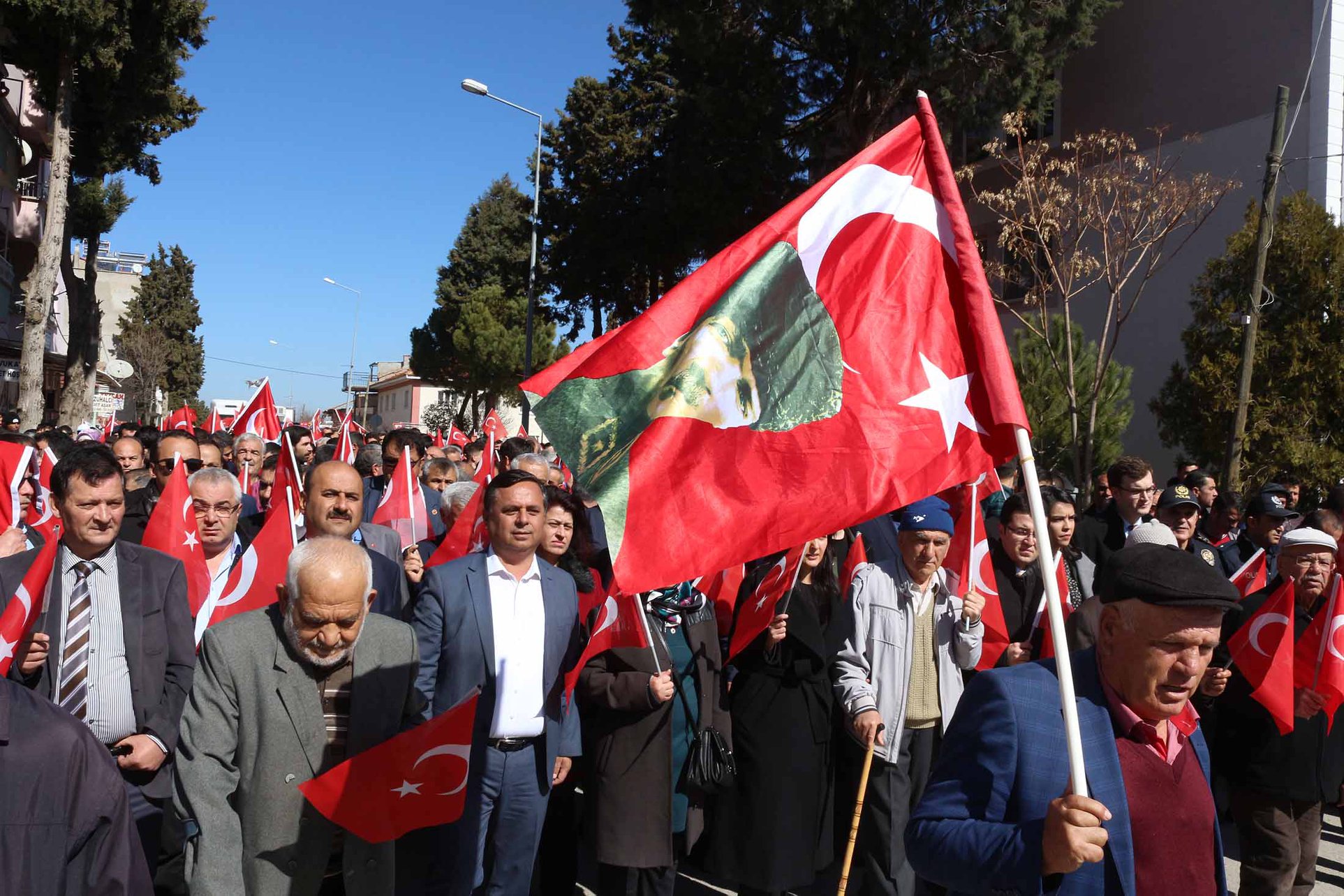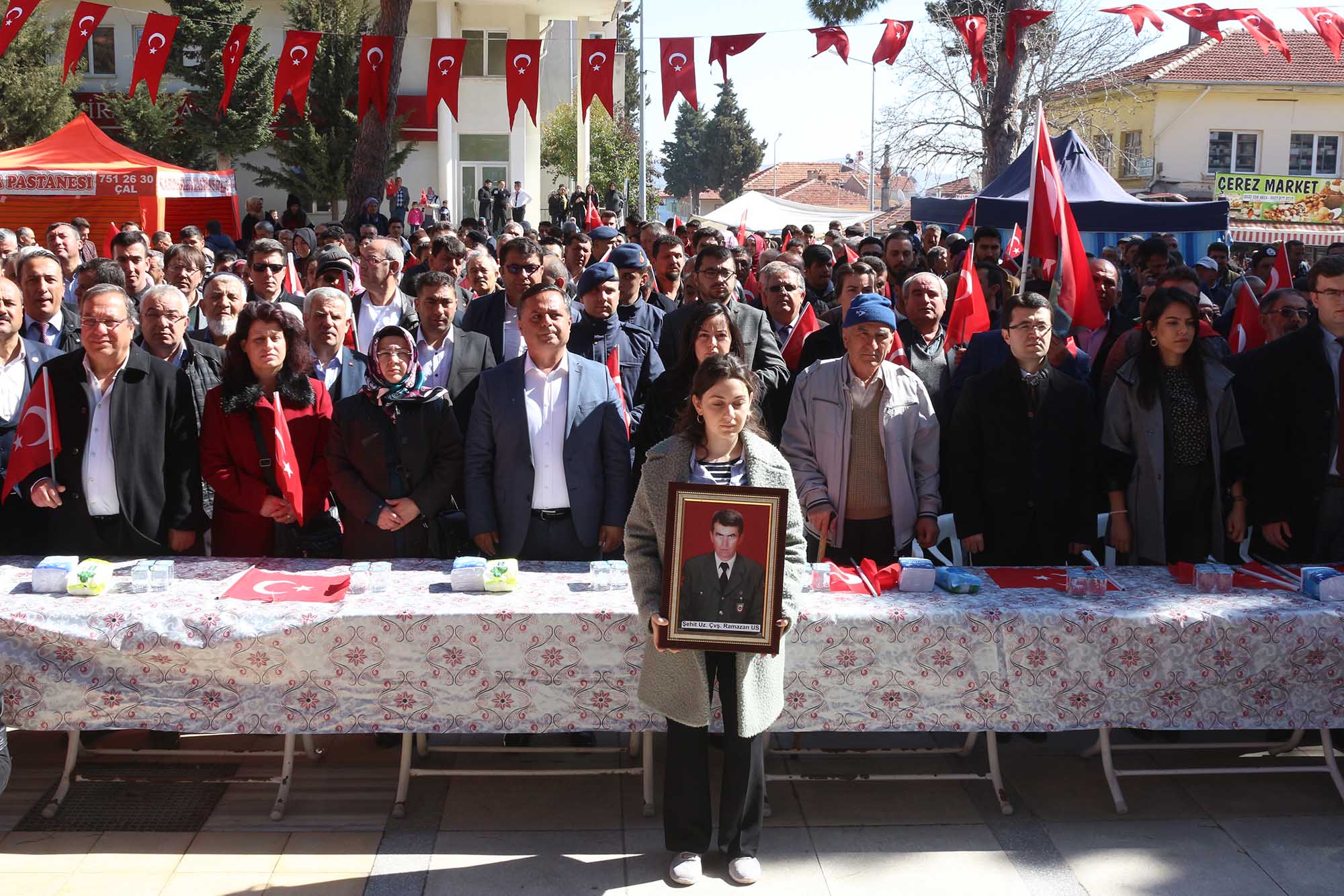 Suriye’nin İdlib kentinde Türk Silahlı Kuvvetleri’ne karşı düzenlenen haince hava saldırısında şehit düşen askerlerimizi anmak, cephede vatan savunması yapan şanlı ordumuza destek için yürüyüş düzenlendi. Bürokratlar, siyasi partilerin temsilcilerinin katıldığı yürüyüşte Çal tek yürek oldu. Çal’ın MHP’li Belediye Başkanı Fethi Akcan, “Atatürk’ün liderliğinde emperyalizme karşı verdiği mücadeleyi Türk milleti nasıl kazandıysa yine kazanacak. Vatan savunması yapan şanlı ordumuzun yanındayız” dedi.