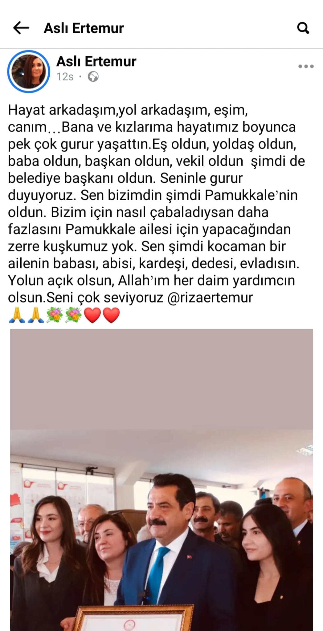 Aslı Ertemur, paylaşımında şu ifadeleri kullandı: “Hayat arkadaşım, yol arkadaşım, eşim, canım… Bana ve kızlarıma hayatımız boyunca pek çok gurur yaşattın. Eş oldun, yoldaş oldun, baba oldun, başkan oldun, vekil oldun şimdi de belediye başkanı oldun. Seninle gurur duyuyoruz. Sen bizimdin şimdi Pamukkale’nin oldun. Bizim için nasıl çabaladıysan daha fazlasını Pamukkale ailesi için yapacağından zerre kuşkumuz yok. Sen şimdi kocaman bir ailenin babası, abisi, kardeşi, dedesi, evladısın. Yolun açık olsun, Allah’ım her daim yardımcın olsun. Seni çok seviyoruz.”