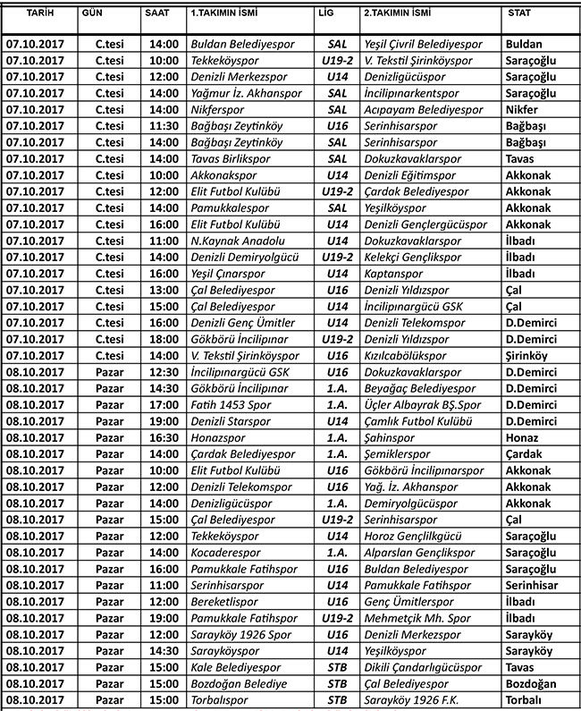 Denizli Amatör Spor Kulüpleri Federasyonu’ndan yapılan açıklamaya göre 4. Hafta, hafta sonu Süper Amatör, 1. Amatör, U19, U16 ve U14 liglerinde oynanacak maçlarla tamamlanacak. Program şöyle: