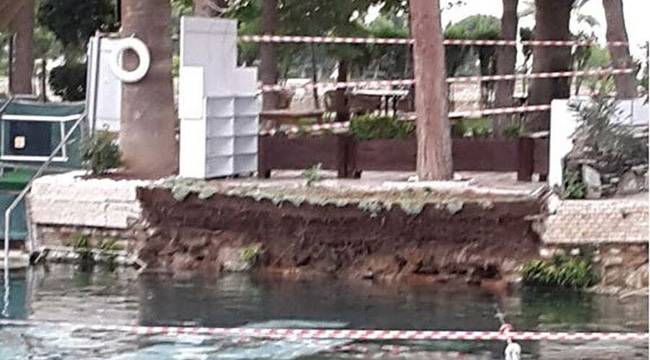 Beyaz travertenleriyle ünlü Pamukkale'de, milattan önce 2'nci yüzyıldan kalan antik havuzun sol bölümündeki merdivenlerin yanında bulunan beton duvar yıkıldı. Duvarın, aşırı yağmur sonrası suyun betonun alt kısmına sızarak toprağı yumuşatması nedeniyle çöktüğü öğrenildi.