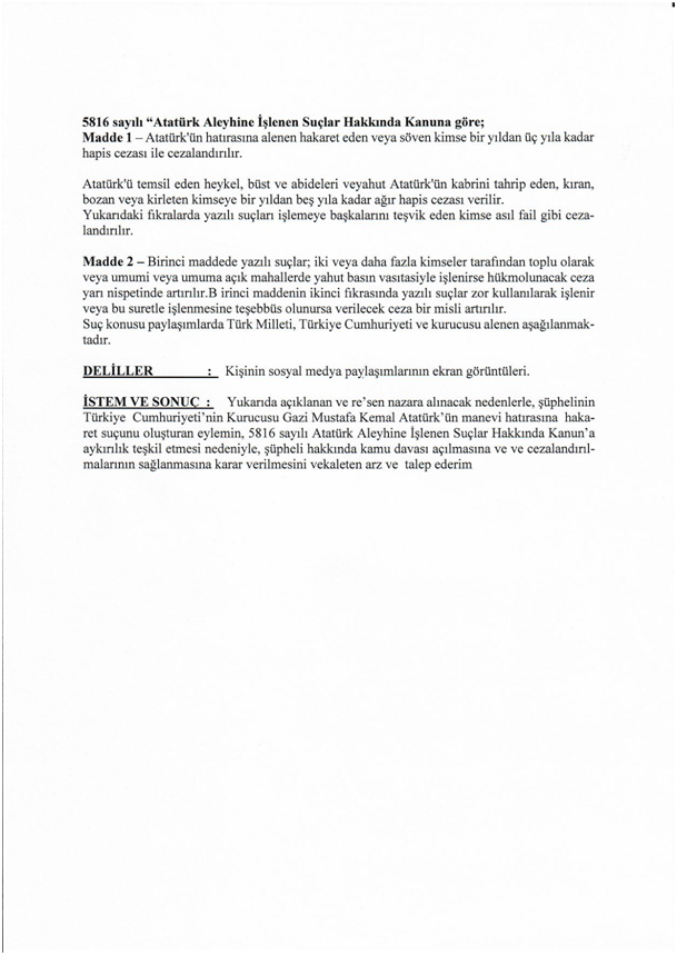 hakkında Cumhuriyet Savcılığına suç duyurusunda bulundum. Atatürk Aleyhine İşlenen