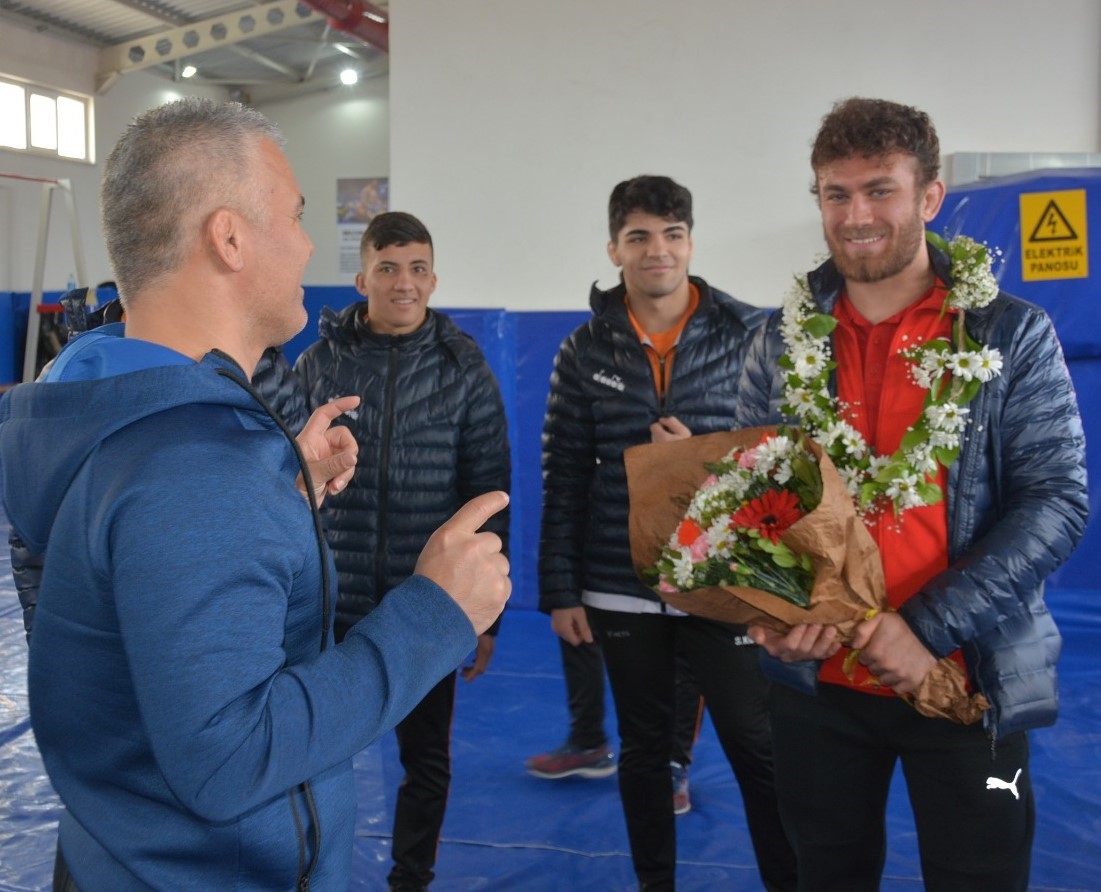 Güreş Eğitim Merkezi sporcuları tarafından çiçeklerle karşılandı. Havaalanı’ndaki karşılamada duygu dolu anlar