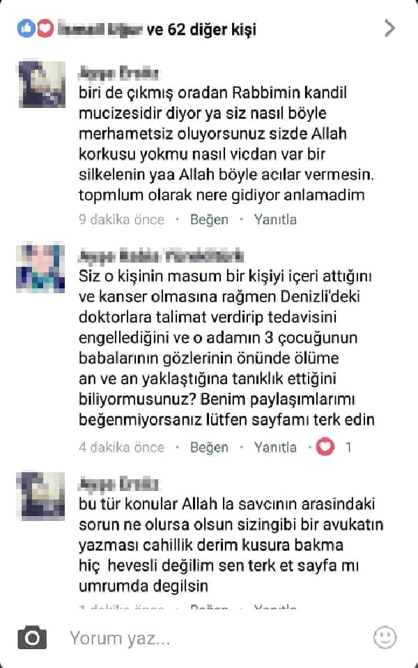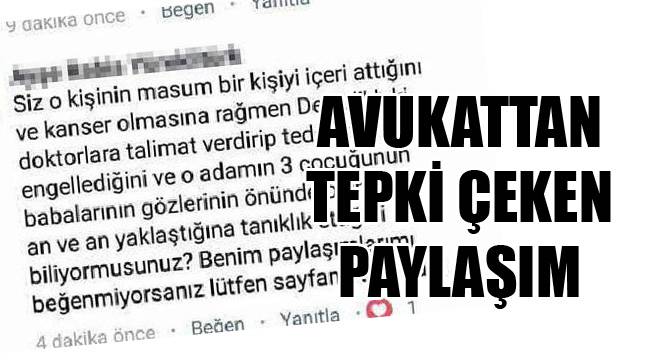 İzmir Barosu'na kayıtlı avukat olan, memleketi Denizli'den geçen seçimde Ak Parti'den milletvekili aday adayı olan A.R.Y., Facebook'taki hesabından yaptığı paylaşım tepki çekti.Avukat A.R.Y., Denizli Cumhuriyet Başsavcısı Mustafa Alper'in geçirdiği kazada yaşamını yitirmesinin ardından, Facebook hesabından, 'Bugün bir kez daha anladım ki ilahi adalette zaman aşımı yok. Masum insanları 35 çapulcunun iftirası ile tutukla, yuvaları dağıt, gerçek FETÖ'cüleri akla, ondan sonra kahraman olarak boy göster, Hesap günü çok yakın. Bize şah damarımızdan yakın olan Rabbime şükürler olsun' paylaşımında bulundu.Denizli'de daha önce Pamukkale Üniversitesi'nin dışarıdan hukuk işlerini takip eden ve FETÖ/PDY'den tutuklu bazı akademisyenlerin avukatlığını yapan A.R.Y.'nin bu paylaşımı eleştirilerin hedefi oldu.Paylaşımın altına bir sosyal medya kullanıcısı 'Biri de çıkmış Rabbimin kandil mucizesidir diyor ya… Siz nasıl böyle merhametsiz oluyorsunuz' diyerek tepki gösterdi. A.R.Y.'nin bu yoruma verdiği yanıtta ise 'Siz o kişinin masum bir kişiyi içeri attığını ve kanser olmasına rağmen Denizli'deki doktorlara talimat verdirip, tedavisini engellediğini ve o adamın 3 çocuğunun babalarının gözlerinin önünde ölüme an ve an yaklaştığına tanıklık ettiğini biliyor musunuz? Benim paylaşımlarımı beğenmiyorsanız lütfen sayfamı terk edin' mesajı göze çarptı.Tepkilerin artması üzerine açıklama yapan A.R.Y., paylaşımının yanlış anlaşıldığını belirterek, "Özel sayfamda yaptığım paylaşımımda isim yoktu. Başsavcı Alper'i kastetmedim, bir yakınımı kastettim. Amaç dışına çıktı, yanlış anlaşıldı. Ben de Başsavcı Bey'in ölümüne bir insan ve hukukçu olarak üzüldüm. Paylaşım yanlış anlaşıldığı için kaldırdım" dedi.