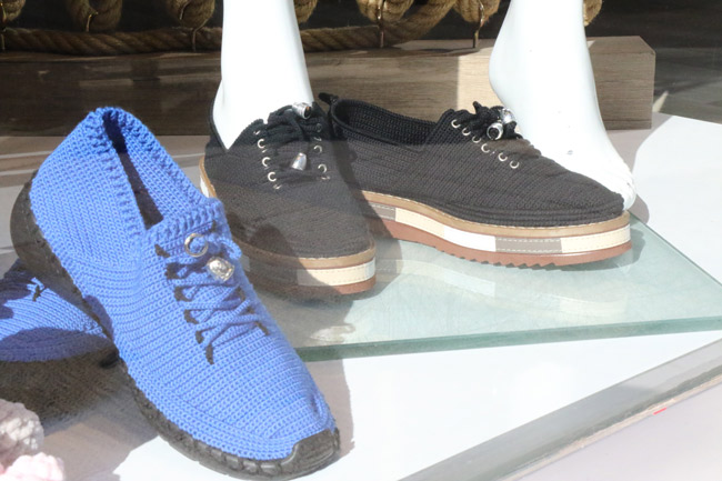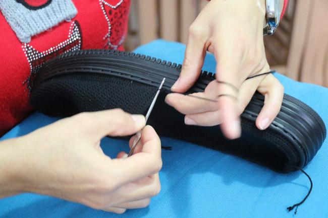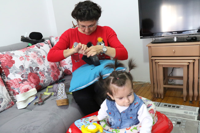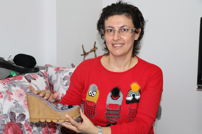 “Örgü ayakkabı yapıyorum, dış mekan. Kazancımı bu şekilde sağlıyorum. Daha önceleri ev ayakkabısı yapıyordum, bir gün yeni bir ayakkabı alıp çarşıya gitmem gerekti ve o gün o ayakkabı ayaklarıma öyle vurdu ki çok canım yandı, sonra eve geldim tekrar ayakkabı yapmaya başladığımda ‘Neden ayakkabının da örgüsü olmasın’ diye düşündüm. Araştırmalara başladım, ‘bunun için tabanları nereden alabilirim, nereden temin edebilirim, daha sağlıklı ipi nereden temin edebilirim’ diye düşünmeye başladım. Sonrasında ise hepsini bir şekilde hallettim ve ayakkabı yapımına başladım.”