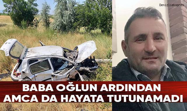 Elazığ’dan Muğla’ya yakınlarını ziyaret için yola çıkan baba, oğul ve amcanın içinde bulunduğu otomobil, Denizli’nin Tavas ilçesinde beton aydınlatma direğine çarparak tarlaya uçtu. Otomobilin hurdaya döndüğü kazada baba oğlun ardından amca da hayatını kaybetti.