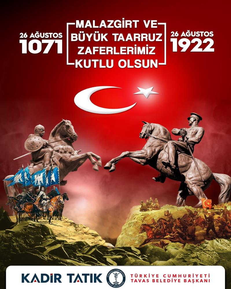 Tavas Belediye Başkanı Kadir Tatık, 26 Ağustos 1071 Malazgirt zaferinin ve 1922 Büyük Taarruz zaferinin yıl dönümlerini yayımladığı mesaj ile kutladı. Tavas Belediye Başkanı Kadir Tatık, 1071 Malazgirt zaferi ile Anadolu’nun kapılarının Türklere açılışını ve 1922 Büyük Taarruz ile sömürgeliğin son bulup bağımsızlığın temelinin atılışının yıl dönümlerini sosyal medyadan yayımladığı mesaj ile kutladı. Başkan Tatık mesajında, "26 Ağustos, milletimizin tarihindeki en önemli dönüm noktalarından biridir. 1071’de Malazgirt Zaferi ile Anadolu’nun kapıları bizlere açılmış, 1922’de Büyük Taarruz ile bağımsızlığımızın temelleri atılmıştır. İki büyük zaferin yıl dönümünde; Malazgirt’te Sultan Alparslan’ı, Büyük Taarruz’da Gazi Mustafa Kemal Atatürk başta olmak üzere tüm kahramanlarımızı rahmet, minnet ve şükranla anıyoruz. Aziz milletimizin Malazgirt ve Büyük Taarruz zaferleri kutlu olsun" ifadelerine yer verdi.