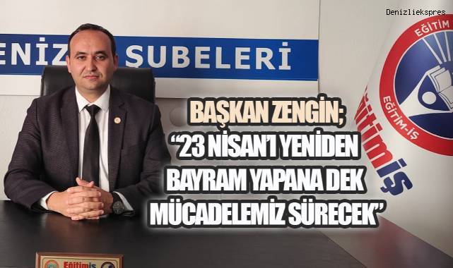 Eğitim-İş 1 No’lu Denizli Şube Başkanı İlker Zengin, 23 Nisan Ulusal Egemenlik ve Çocuk Bayramı dolayısıyla yaptığı açıklamada, çocukların içinde bulunduğu tabloya sert sözlerle tepki gösterdi. Zengin, “23 Nisan’ı gerçek anlamıyla bayram haline getirecek koşullar sağlanana kadar mücadelemiz sürecek” dedi.