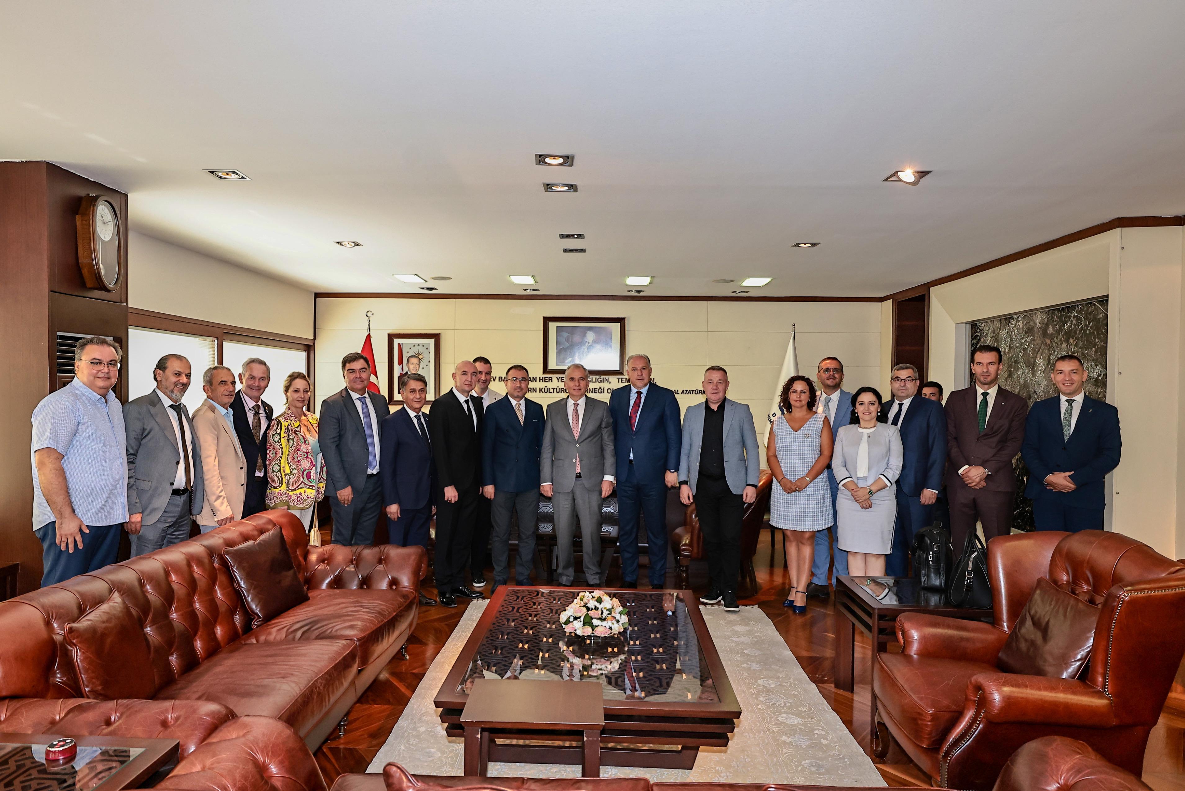 Denizli Büyükşehir Belediye Başkanı Osman Zolan, Kosova Bölgesel Kalkınma Bakanı Fikrim Damka ve beraberindekileri ağırladı. Avrasya Yönetici Sanayici ve İşadamları Derneği (AYSİAD) Denizli Şubesinin daveti kapsamında Denizli’ye gelen heyet Denizli Büyükşehir Belediye Başkanı Osman Zolan’ı ziyaret etti. Ziyarete Kosova Bölgesel Kalkınma Bakanı Fikrim Damka, Avrasya Ekonomik İlişkiler Derneği (EkoAvrasya) Yönetim Kurulu Başkanı Hikmet Eren, Avrasya Yönetici Sanayici ve İşadamları Derneği (AYSİAD) Denizli Şube Başkanı Mahmut Catlık ve beraberindekiler katıldı. Ziyaretten büyük bir memnuniyet duyduğunu belirten Başkan Osman Zolan, “Denizli’mize hoş geldiniz. Bizler gönül birliği olan kardeşleriz. Sizleri ağırlamaktan dolayı çok mutluyum, ayaklarınıza sağlık. İnşallah dayanışma içerisinde birbirimize ait güzellikleri ortaya çıkarmayı nasip etsin. Varsa zorlukları birlikte aşacağız, güzellikleri birlikte ortaya çıkaracağız. Gönül birliği ve kardeşlik bilinci ile hedefe doğru koşacağız. İşbirlikleri ile kardeşliğimizi güçlendirmemiz gerekiyor. Sizlerle birlikte olmak bizlere güç veriyor, mutlu ediyor. Kosova bizim ecdadımızın olduğu ve tarihimizde çok önemli bir yerde bulunuyor” diye konuştu.