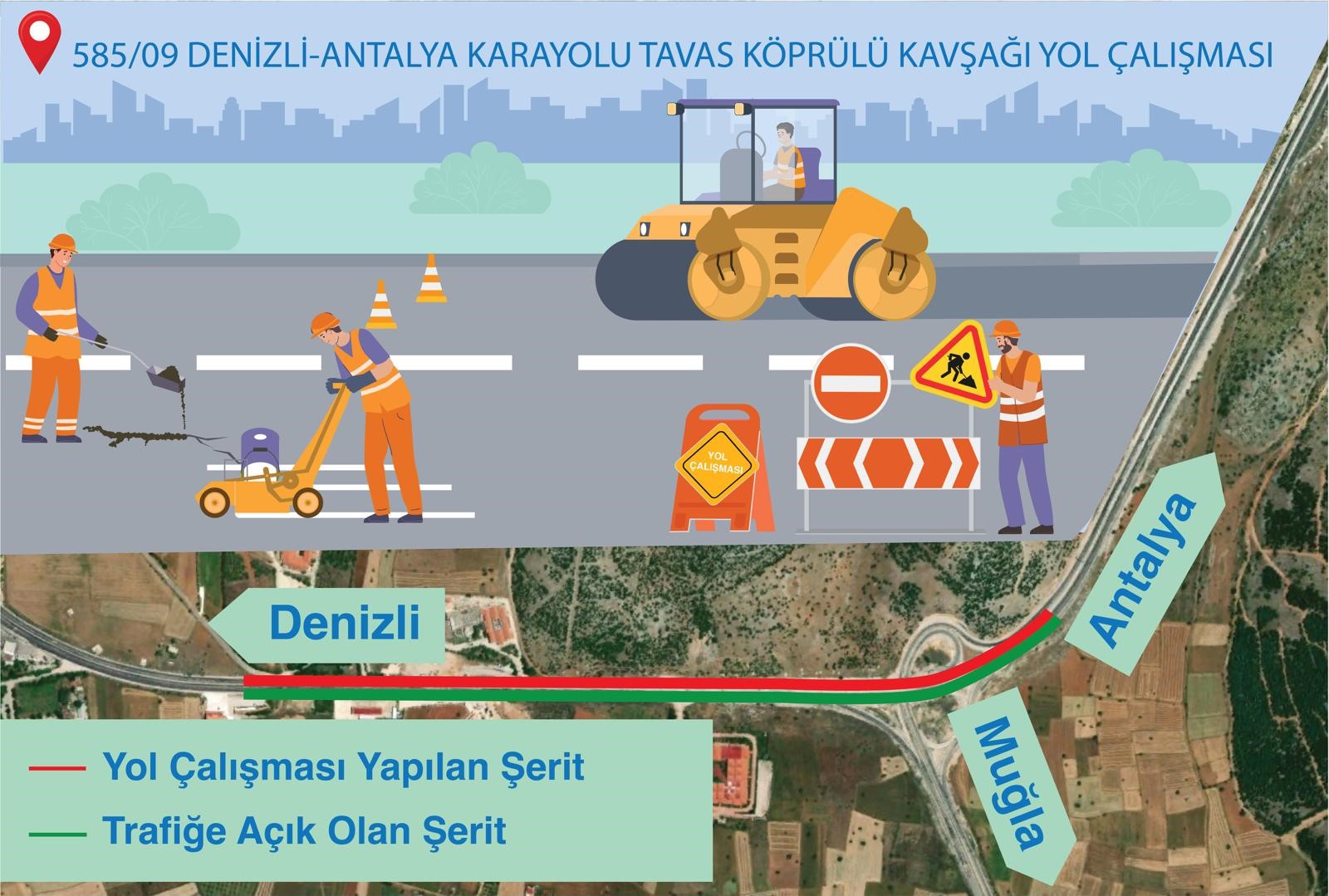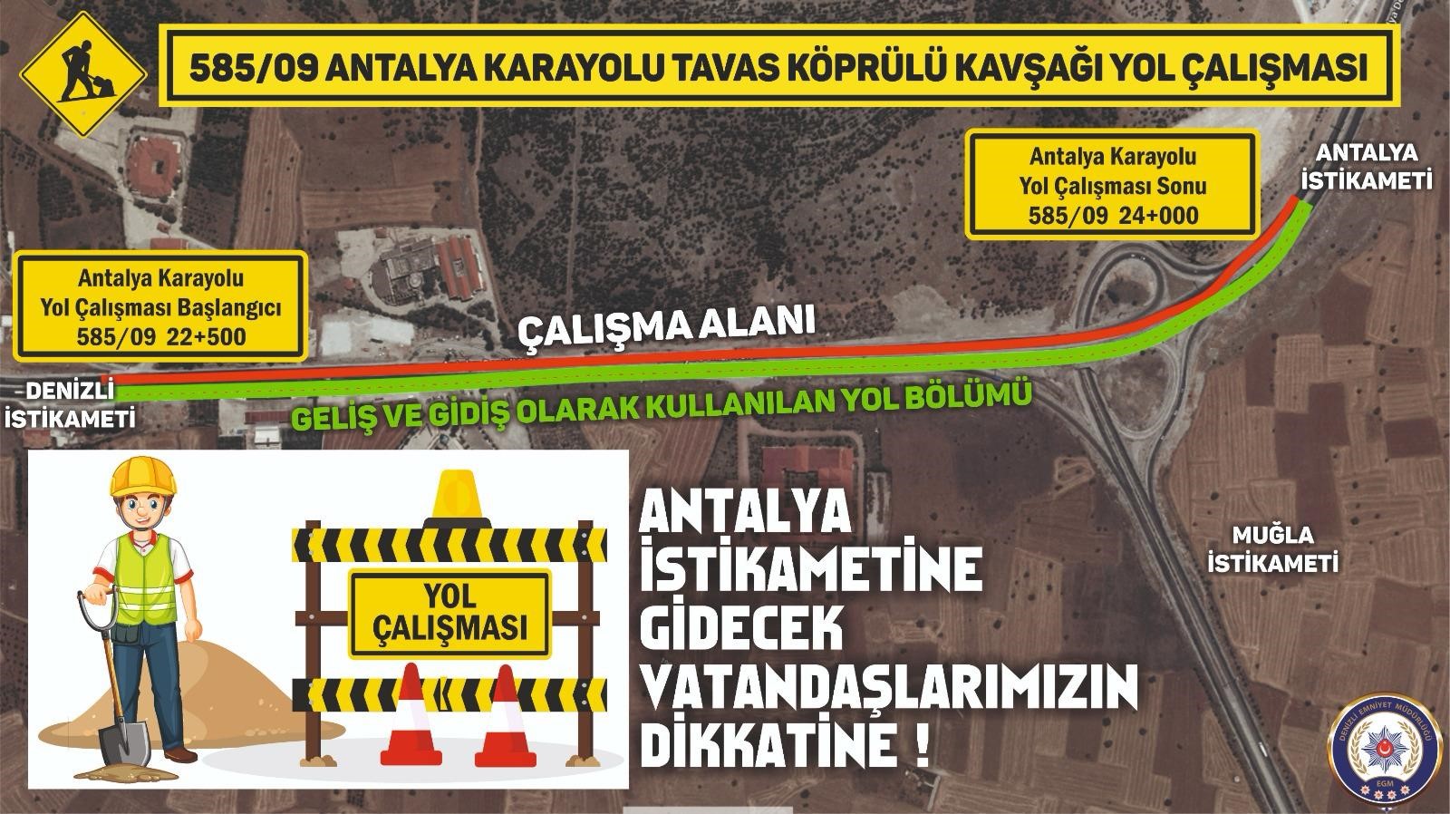 Denizli İl Emniyet Müdürlüğü, Denizli-Antalya karayolu üzerinde yapılan yol çalışması sebebiyle 2 kilometrelik alanın trafiğe kapatıldığını ve bayram tatilinde de çalışmaların devam edeceğini duyurup, sürücülerin dikkatli olması konusunda uyardı.