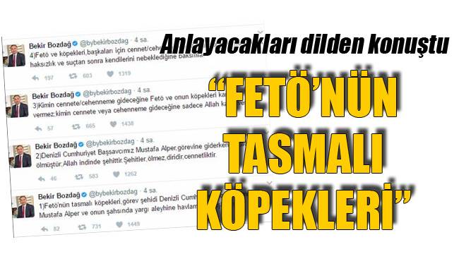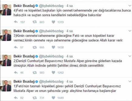 Adalet Bakanı Bekir Bozdağ, trafik kazasında şoförüyle birlikte yaşamını yitiren Cumhuriyet Başsavcısı Mustafa Alper ile ilgili Twitter hesabından açıklama yaptı.Bozdağ, "FETÖ'nün tasmalı köpekleri, görev şehidi Denizli Cumhuriyet Başsavcımız Mustafa Alper ve onun şahsında yargı aleyhine havlamaya başlamışlar. Denizli Cumhuriyet Başsavcımız Mustafa Alper, görevine giderken kazada ölmüştür; Allah indinde şehittir. Şehitler,ölmez, diridir, cennetliktir. Kimin cennete cehenneme gideceğine FETÖ ve onun köpekleri karar vermez; kimin cennete veya cehenneme gideceğine sadece Allah karar verir" dedi.