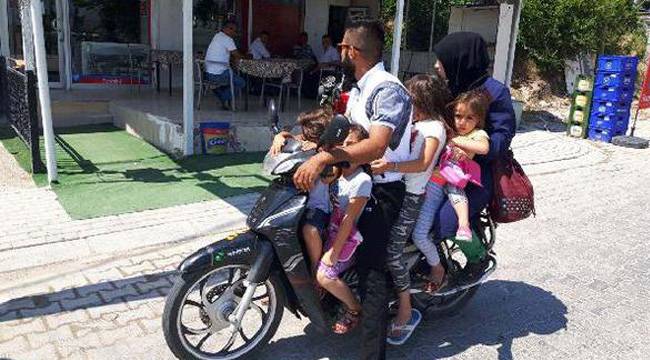 Denizli'nin Honaz İlçesi'nde trafik kontrolü yapan jandarma ekipleri, bir motosiklete 4'ü çocuk 2'si yetişkin olmak üzere 6 kişinin bindiğini görünce gözlerine inanamadı. Durdurulan motosiklet sürücüsüne kaskı olmadığı, fazla yolcu almak ve ehliyetsiz olduğu gerekçesiyle toplam bin 953 lira para cezası kesildi.Honaz Jandarma Karakolu Trafik Timi, Ramazan Bayramı önlemleri kapsamında dün Honaz İlçesi'nde trafik kontrolü yaptı. Kontrol noktasına giren araçların sürücülerinin ehliyet ve ruhsat belgeleri incelendi, eksik olanlara ceza kesildi. Trafik kontrolü sırasında üzerinde 4'ü çocuk 2'si yetişkin 6 kişinin bulunduğu motosikleti gören jandarma trafik timi, motosikleti durdurdu. Jandarma ekipleri, 20 BFU 59 plakalı motosikleti kullanan baba A.C.'nin 2 çocuğu önüne, arkada oturan eşinin de diğer 2 çocuğunu kucağına alarak, hayatlarını tehlikeye atarak yolculuk yahpmasına tepki gösterdi. Yapılan incelemede A.C.'nin ehliyetinin de olmadığı ortaya çıktı. Eşini ve çocuklarını tehlikeye atan motosiklet sürücüsü A.C.'ye ehliyeti olmadığı, kask takmadığı ve fazla yolcu taşıdığı için toplam 1953 lira para cezası kesildi, motosiklet bağlandı.