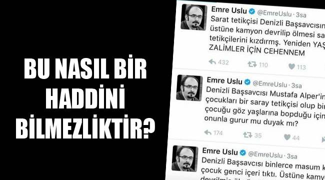 Denizli’de bugün sabah saatlerinde meydana gelen trafik kazası, Denizli halkını adeta yasa bürüdü. Denizli Cumhuriyet Başsavcısı Mustafa Alper ve yıllardır makam şoförlüğü yapan Muzaffer Akşehirli, ehliyetsiz olarak kamyon kullanan bir sürücünün trafik kurallarına riayet etmemesi sonucu hayatını kaybetti. Denizli’de Fethullahçı Terör Örgütüne karşı dik duruşu ile tanınan Denizli Cumhuriyet Başsavcısı Mustafa Alper’in yanı sıra Denizli Adliyesi’nde 32 yıldır makam şoförlüğü yapan hayatındaki ilk trafik kazası sonuncu olan Muzaffer Akşehirli’nin şehit düştüğü kazanın ardından FETÖ’nün kalem silahşörü olarak bilinen Emre Uslu’nun sosyal medyadan yaptığı paylaşım büyük tepki gördü.Denizli Cumhuriyet Başsavcısı Mustafa Alper’in ölümünü büyük bir sevinç ile karşılayan ve bunu utanmadan twitter hesabından paylaşan Emre Uslu’nun sarf ettiği sözler bu kadar da olmaz dedirtti. Twitter paylaşımını okuyanlar bu nasıl bir haddini bilmezlik sorusunu sorarken, kin ve nefretiçeren bu paylaşıma tepkiler de sert oldu.