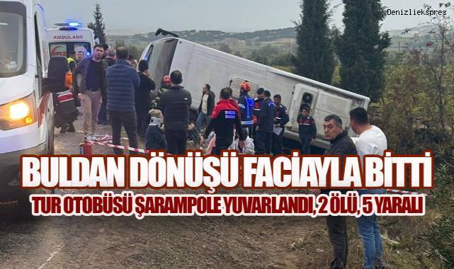 Denizli’nin Buldan ilçesinde meydana gelen feci kazada, İzmir’den günübirlik gezi için gelen turist kafilesini taşıyan otobüs dönüş yolunda şarampole yuvarlandı. Kazada 2 kişi yaşamını yitirirken, 5 kişi de yaralandı.