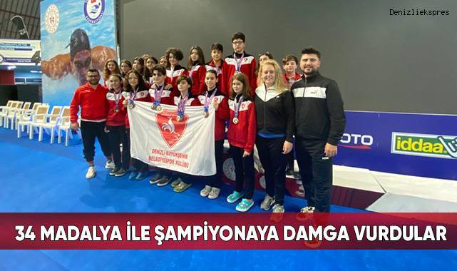 Denizli Büyükşehir Belediyespor Yüzme Takımı’nda A3 ve A4 barajını geçen 7 sporcunun aldığı altın madalya ile birlikte toplamda 34 madalya kazanan bizim çocuklar şampiyonaya damgasını vurdu.