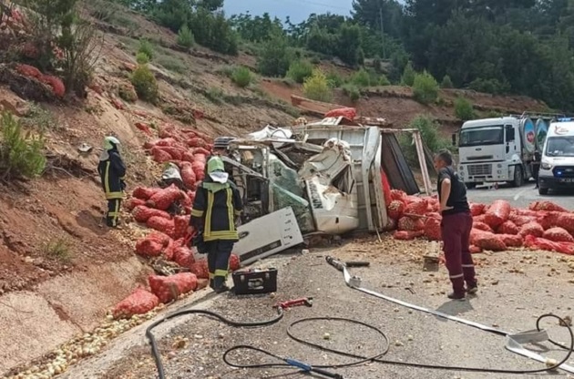 Kazada kamyon hurdaya dönerken, tonlarca soğan ise çuval çuval yere döküldü.