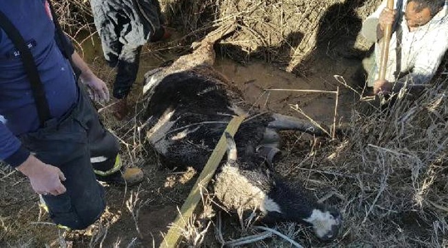 Denizli'nin Sarayköy İlçesi'nde su kanalına düşüp çamura saplanan inek, itfaiye ekipleri tarafından kurtarıldı.