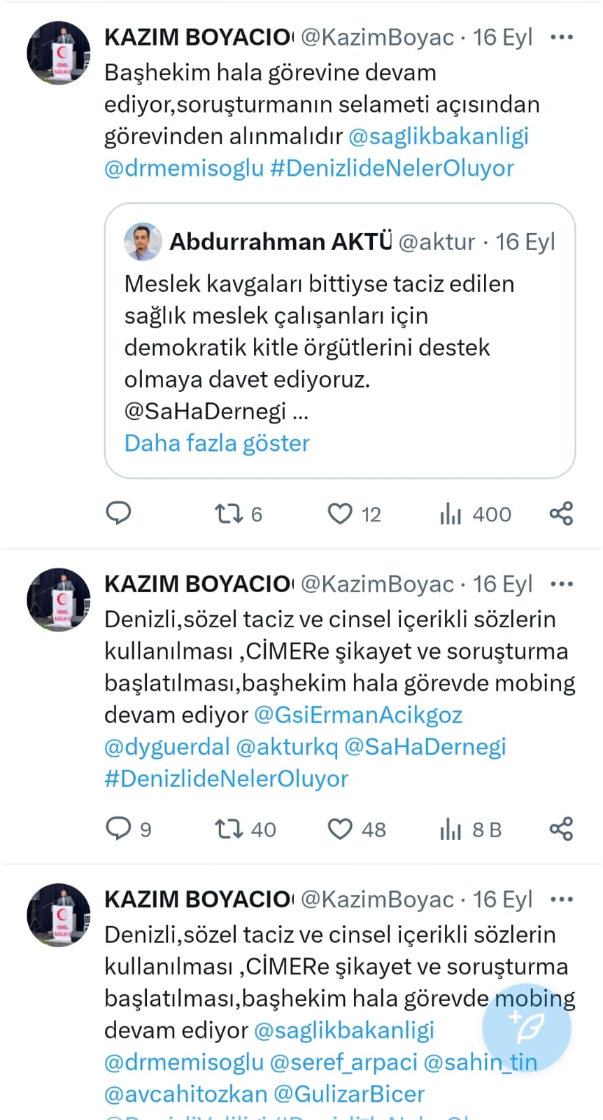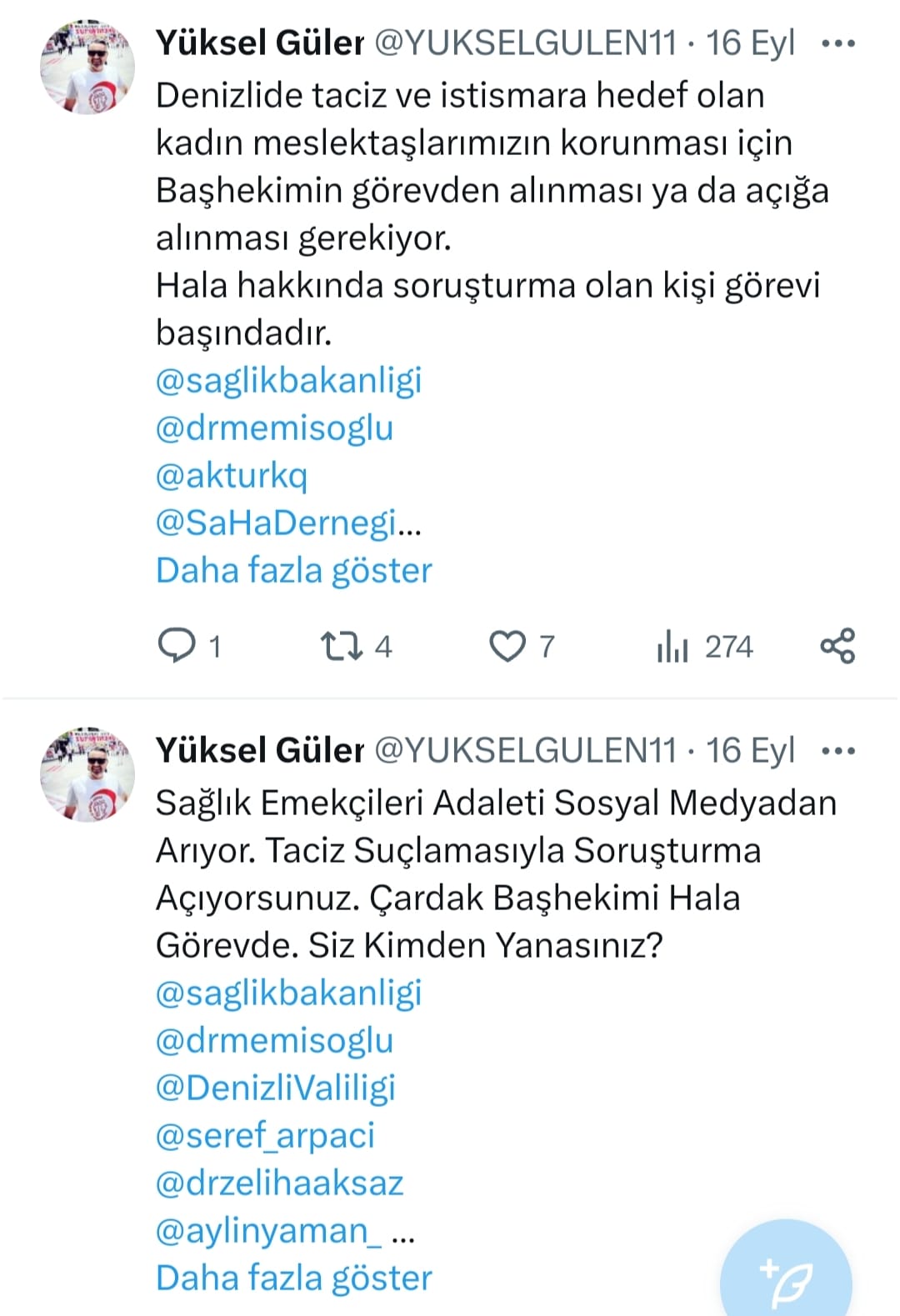 Yine Çardak Devlet Hastanesi Başhekimi K.S.Ö'nün sözlü cinsel tacizini sosyal medya hesabı X'te paylaşan Genel Sağlık İş Sendikası Denizli İl Örgütlenme Sekreteri Yüksel Gülen, "Sağlık Emekçileri Adaleti Sosyal Medyadan Arıyor. Taciz Suçlamasıyla Soruşturma Açıyorsunuz. Çardak Başhekimi Hala Görevde. Siz Kimden Yanasınız?" diye sordu.