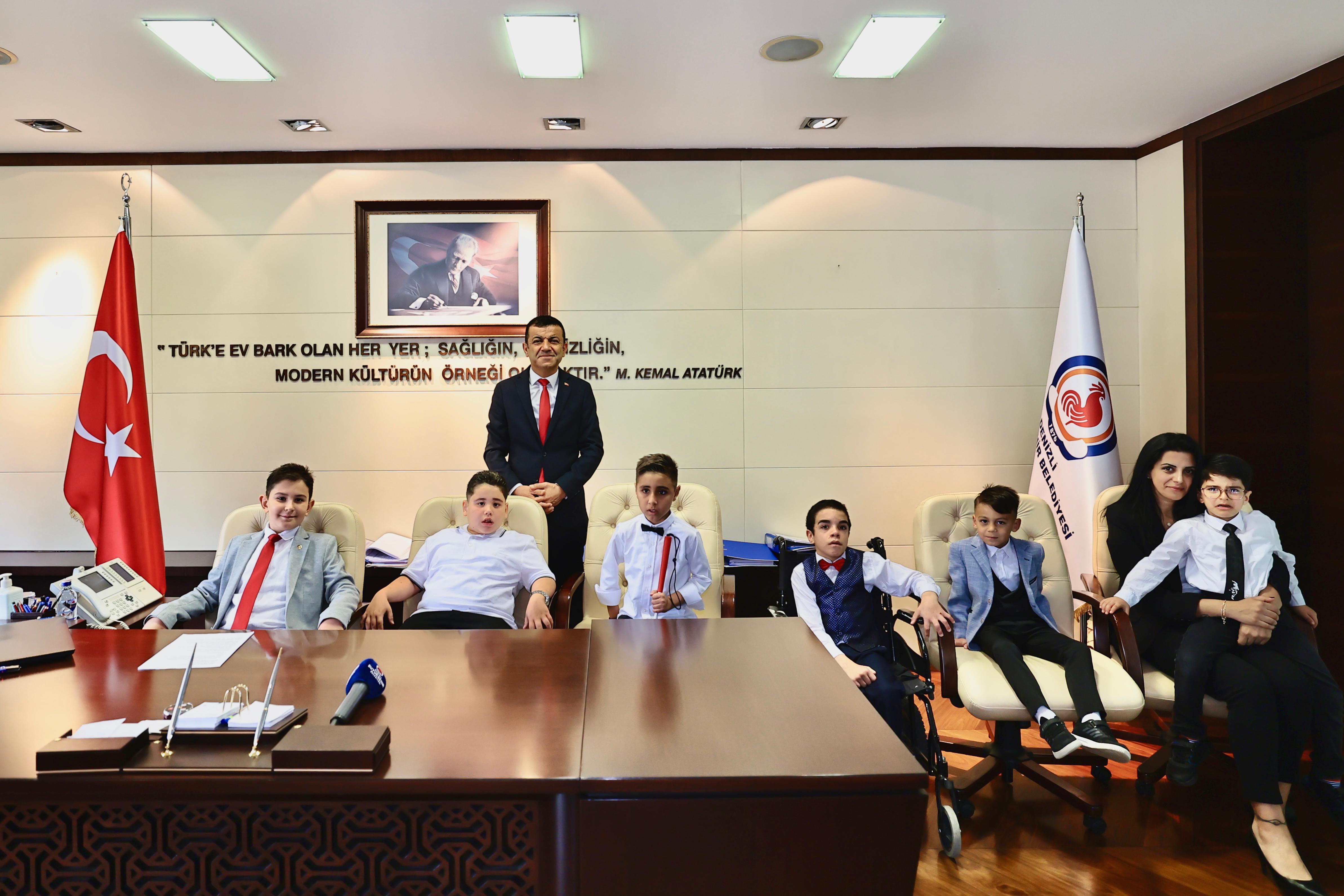 Denizli Büyükşehir Belediye Başkanı Bülent Nuri Çavuşoğlu, 23 Nisan Ulusal Egemenlik ve Çocuk Bayramı kutlamaları kapsamında koltuğunu çocuklara devretti. Denizli’de ilk kez bu yıl 23 Nisan’da özel çocukları da unutmayan Başkan Çavuşoğlu koltuğunu 6 çocukla paylaştı. Başkan Çavuşoğlu 23 Nisan sabahı Atatürk Ortaokulu’ndan Kaan Ülkülü ile birlikte Yeşilköy İşitme Engelliler İlkokulu 4. Sınıf öğrencisi Efekan Ayvaz, Denizli Görme Engelliler İlkokulu 2. Sınıf öğrencisi Taci Efe Erdoğan, Polis Amca Özel Eğitim Okulu öğrencisi Abdurrahman Yılmaz, Oktay Mersin Özel Eğitim Anaokulu öğrencisi Burak Bahar ve Kelleci İlkokulu Anasınıfı öğrencisi Ramazan Yılmaz’ı makamında ağırladı.