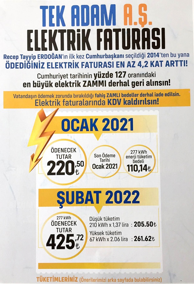 Aralık2021-Ocak 2022 döneminde vatandaşlarımızdan tahsil edilen yüzde127’ye varan fahiş zamlı elektrik tüketim bedelleri iade edilmelidir.