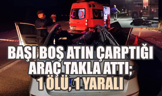 Denizli’nin Çivril ilçesinde, yola aniden fırlayan başıboş bir at cana mal oldu. Gece saatlerinde seyir halindeki otomobilin üzerine düşen at, aracın tavanını çökertti. Kazada yolcu koltuğundaki Resul Yeşilyurt hayatını kaybederken, sürücü Sadık Aydoğdu ağır yaralandı. Çarpmanın etkisiyle metrelerce savrulan at ise olay yerinde telef oldu.