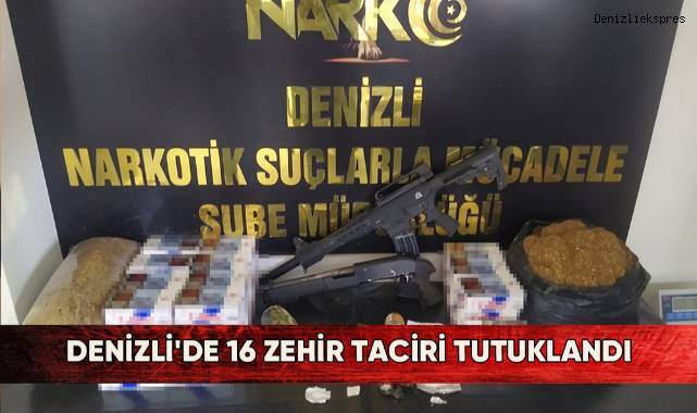 Denizli’de yapılan eş zamanlı operasyonlarda tutuklanan 16 zehir tacirinden kilolarca uyuşturucu maddesi çıktı.