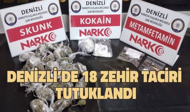 Denizli'de yapılan eş zamanlı operasyonlarda yüklü miktarda uyuşturucu maddeyle yakalanan 18 zehir taciri, tutuklanarak cezaevine gönderildi.