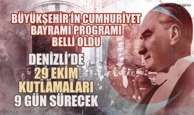 Denizli Büyükşehir Belediyesinin, 29 Ekim Cumhuriyet Bayramı kutlamalarının tüm kenti sarması ve vatandaşların 101. yıl coşkusunu doyasıya yaşaması için hazırladığı programlar açıklandı. Türkiye Cumhuriyeti’nin 101. kuruluş yıldönümüne özel 9 gün sürecek programda 34 farklı etkinliğin yer aldığı açıklanırken, 29 Ekim Cumhuriyet Bayramı için Denizli’de ilk kez bu kadar uzun soluklu bir kutlama takvimini hazırlanması dikkat çekti. 21 Ekim 2024 Pazartesi günü Denizli Büyükşehir Belediyesi Şehir Tiyatrosu’nun kukla gösterisi ve Cumhuriyet Kupası Futbol Turnuvası ile başlayacak Cumhuriyet Bayramı kutlamaları 29 Ekim’e kadar farklı etkinliklerle sürecek. Konserlerden spor turnuvalarına, defile ve sergilerden film gösterimlerine Cumhuriyet Bayramı’nın Denizli’de dolu dolu kutlanması için düzenlenen programlara Berkay, Eypio, Özgür Can Çoban, Göksel Doğançay, Kubat ve Evgeny Grinko konserleri damga vuracak.