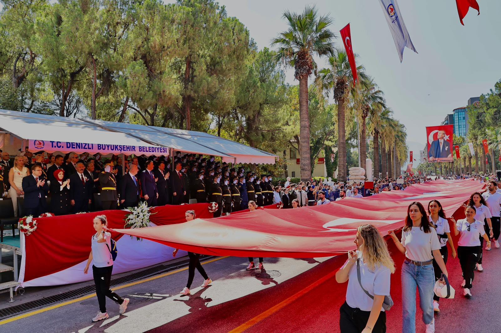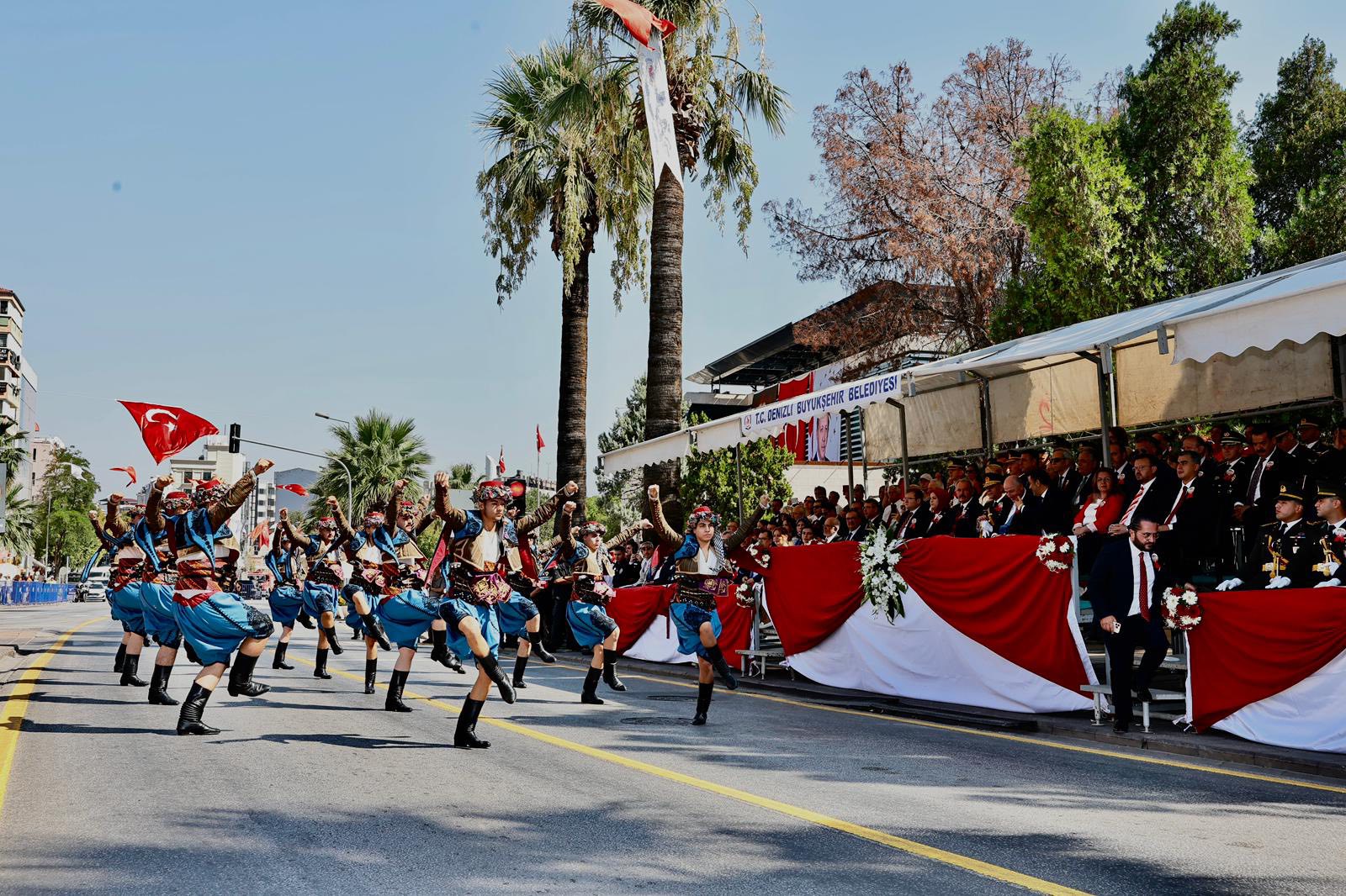 Törende Tavas Belediyesi halk oyunları ekibinin sergilediği gösteri renkli görüntüler oluşturdu. Daha sonra başlayan geçit töreninde askeri birlikler, zırhlı araçlar, gaziler ve sporcular Türk bayrağı ile Atatürk posterini taşıyarak yürüdü. Denizlililer, korteji uzun süre alkışlarla destekledi.