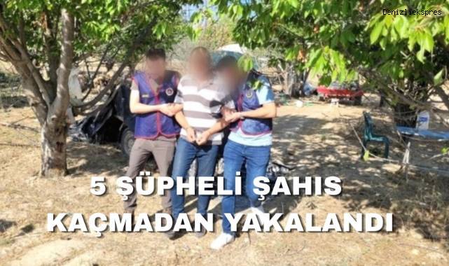 Denizli’nin farklı ilçelerinde kasten öldürme, dolandırıcılık hırsızlık ve silahlı terör örgütü üye olma gibi farklı suçlardan aranan ve toplamda 63 yıl 9 ay 25 gün hapis cezası ile aranan 5 şüpheli şahıs kaçmaya fırsat verilmeden yakalanarak tutuklandı.