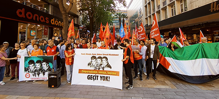 Açıklamada, Deniz Gezmiş ve arkadaşlarının Filistin halkı için verdiği mücadele vurgulandı. Burlu, mevcut hükümetin Filistin halkının özgürlük taleplerini istismar ederken İsrail’le ticareti sürdürdüğünü belirtti. “AKP’li Nihat Zeybekci, ‘Filistin’de katliam var eyvallah ama İsrail serbest ticaret anlaşmamızın olduğu bir ülke’ demişti. Pamukkale Kablo, İsrail devletine kablo ihraç ediyor,” şeklinde konuşan Burlu, İsrail’le ticaretin Filistin’e ihanet olduğunu ifade etti. “İsrail’le ticaret Filistin’e ihanet!” sloganıyla İsrail’le ticari ilişkilerin sona ermesi talep edildi.