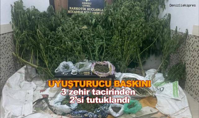 Denizli Emniyet Müdürlüğüne bağlı Narkotik Suçlarla Mücadele Şube Müdürlüğü ekipleri Çivril ilçesinde zehir tacirliği yapan şüpheli şahısları takibe aldı. Kısa süreli fiziki ve teknik takibin ardından 3 şüpheli şahıslara yönelik operasyon düzenlendi. Operasyonda 3 zehir taciri kıskıvrak yakalanırken, şüpheli şahısların ikametlerinde ise arama yapıldı. Yapılan aramalar neticesinde 4 kilo 568 gram esrar, 13 kök kenevir, 3 av tüfeği ve 1 ruhsatsız tabanca ele geçirildi. Emniyetteki işlemlerinin ardından adliyeye sevk edilen 3 zehir tacirinden 2’si tutuklanarak cezaevine gönderildi.