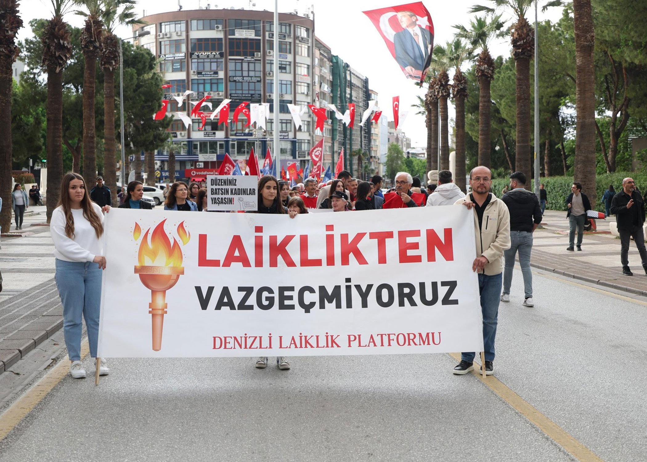 Denizli Laiklik Platformu öncülüğünde düzenlenen yürüyüşte bugün sokaklar adalet ve laiklik sloganlarıyla inledi. Denizli Valiliği önünden başlayan yürüyüş, Çınar Meydanı’nda yapılan basın açıklamasıyla son buldu. Eyleme birçok sivil toplum kuruluşunun temsilcileri, siyasi parti üyeleri ve Merkezefendi Belediye Başkanı Şeniz Doğan da katıldı.