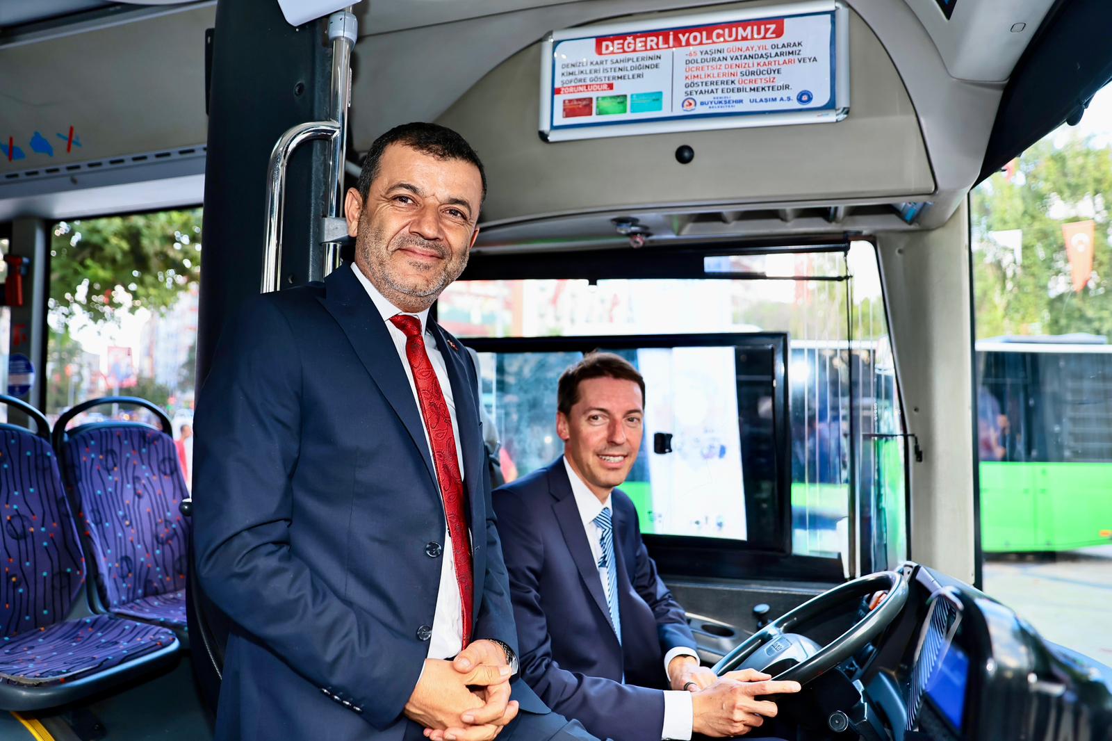 Program sonunda Başkan Çavuşoğlu ve Vılcinskas, proje kapsamında yenilenen belediye otobüsünün direksiyonuna geçerek basın mensuplarına poz verdi.