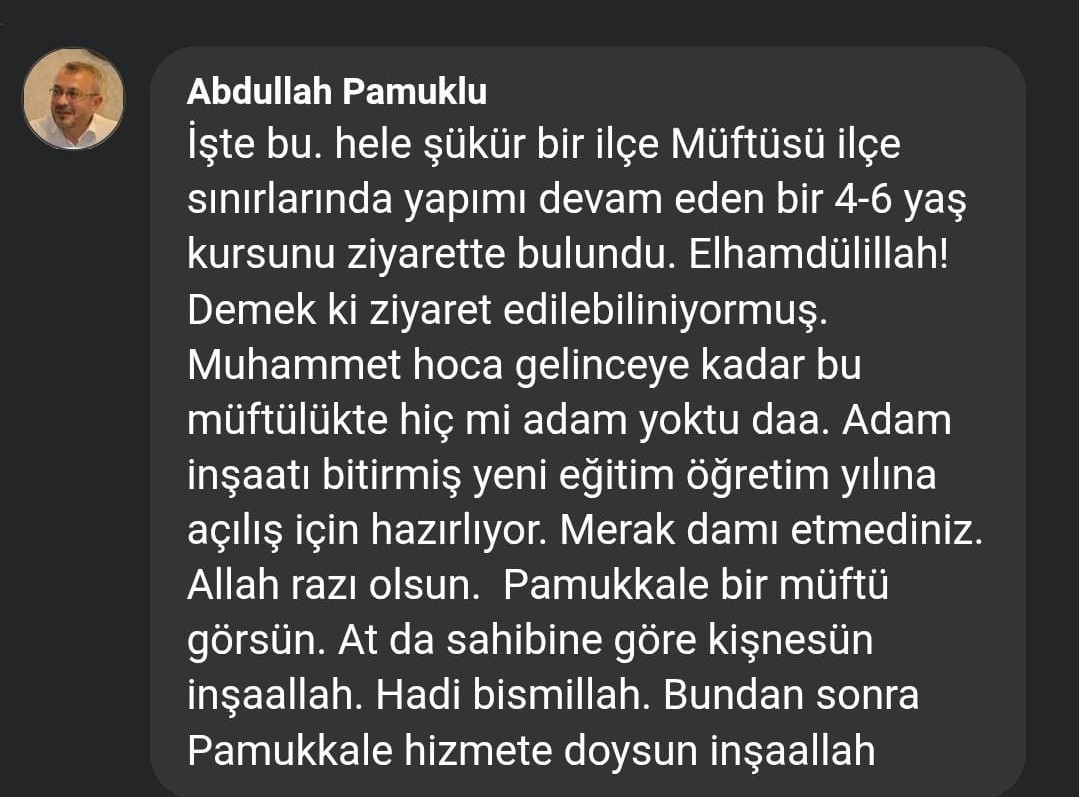 Denizli İl Müftüsü Abdullah Pamuklu, sosyal medyada yaptığı tartışmalı yorumla gündemin merkezine oturdu. Pamuklu’nun, Pamukkale eski ilçe müftüsünü hedef alan ve hakaret ile iftira niteliği taşıdığı iddia edilen sözleri yargıya taşındı.Denizli İl Müftüsü Abdullah Pamuklu’nun sosyal medyada yaptığı yorum, kamuoyunda büyük tepki topladı. Pamuklu, sosyal medyada bir paylaşımın altına yaptığı yorumda “İşte bu. hele şükür bir ilçe Müftüsü ilçe sınırlarında yapımı devam eden bir 4-6 yaş kursunu ziyarette bulundu. Elhamdülillah! Demek ki ziyaret edilebiliniyormuş. Muhammet hoca gelinceye kadar bu müftülükte hiç mi adam yoktu daa. Adam inşaatı bitirmiş yeni eğitim öğretim yılına açılış için hazırlıyor. Merak damı etmediniz. Allah razı olsun. Pamukkale bir müftü görsün. At da sahibine göre kişnesün inşaalah. Hadi bismillah. Bundan sonra Pamukkale bir müftü görsün.” ifadelerine yer vermişti.
