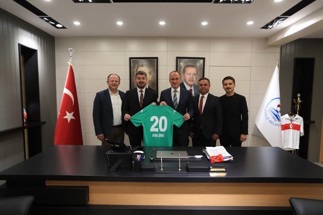 Denizlispor Başkanı Mehmet Uz, Başkan Yardımcımız Fethi Akcan ve yöneticilerden Seyit Berber ile İsmet Kaya, Pamukkale Belediye Başkanı Avni Örki'ye nezaket ziyaretinde bulundu. Başkan Mehmet Uz'un destek talebini kırmayan ve kulübe olan desteklerinin devam edeceğini belirten Avni Örki, ziyaretleri için yönetim kuruluna teşekkür etti. Konuşmaların ardından Başkan Örki’ye isminin yazılı olduğu Denizlispor forması hediye edildi. Ardından yönetim ve Başkan Örki hatıra fotoğrafı çektirdi.