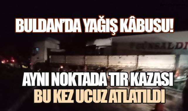 Edinilen bilgiye göre, Buldan yönüne seyir halinde olan bir tır, yağış nedeniyle kayganlaşan yolda direksiyon hâkimiyetini kaybederek şarampole devrildi. Aynı istikamette ilerleyen diğer bir tır sürücüsü ise devrilen araca çarpmamak için ani manevra yaptı. Ancak bu manevra sonucu kontrolü kaybeden tır orta refüje çıkarak durabildi.