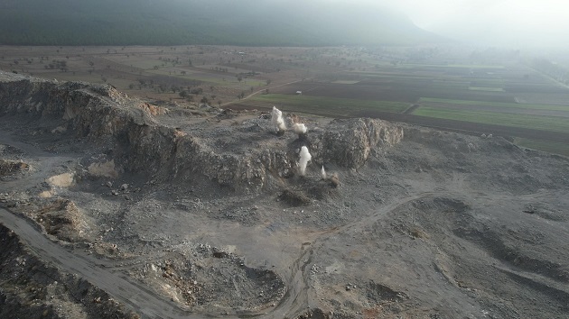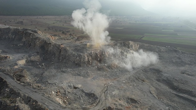 Taş ocağından hammadde çıkartmak için dev kayaların dinamitle patlatılma anı, yerden ve havadan görüntülendi.