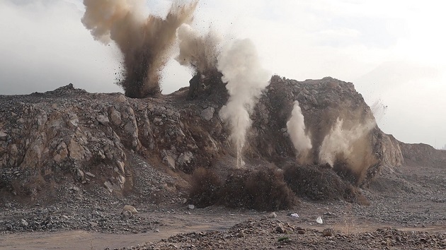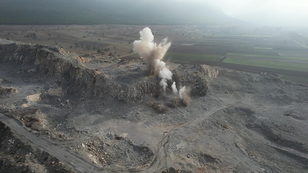 Görüntülerde patlamanın şiddetiyle dev kayaların parçalandığı ve oluşan toz bulutunun yerden metrelerce yükseldiği anlar yer aldı.