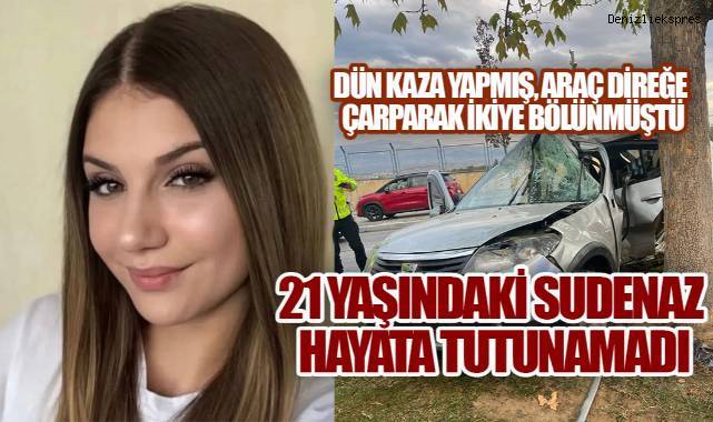 Denizli Merkezefendi’de dün meydana gelen kazada ağır yaralanan 21 yaşındaki Sudenaz Sargın, doktorların tüm müdahalesine rağmen kurtarılamadı. Otomobilin yol kenarındaki ağaca çarpması sonucu araç büyük hasar gördü.