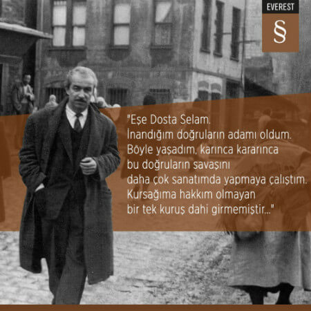 İnandığım doğruların adamı oldum, böyle yaşadım, karınca kararınca bu doğruların savaşını daha çok sanatımda yapmaya çalıştım, kursağıma hakkım olmayan bir tek kuruş dahi girmemiştir…”