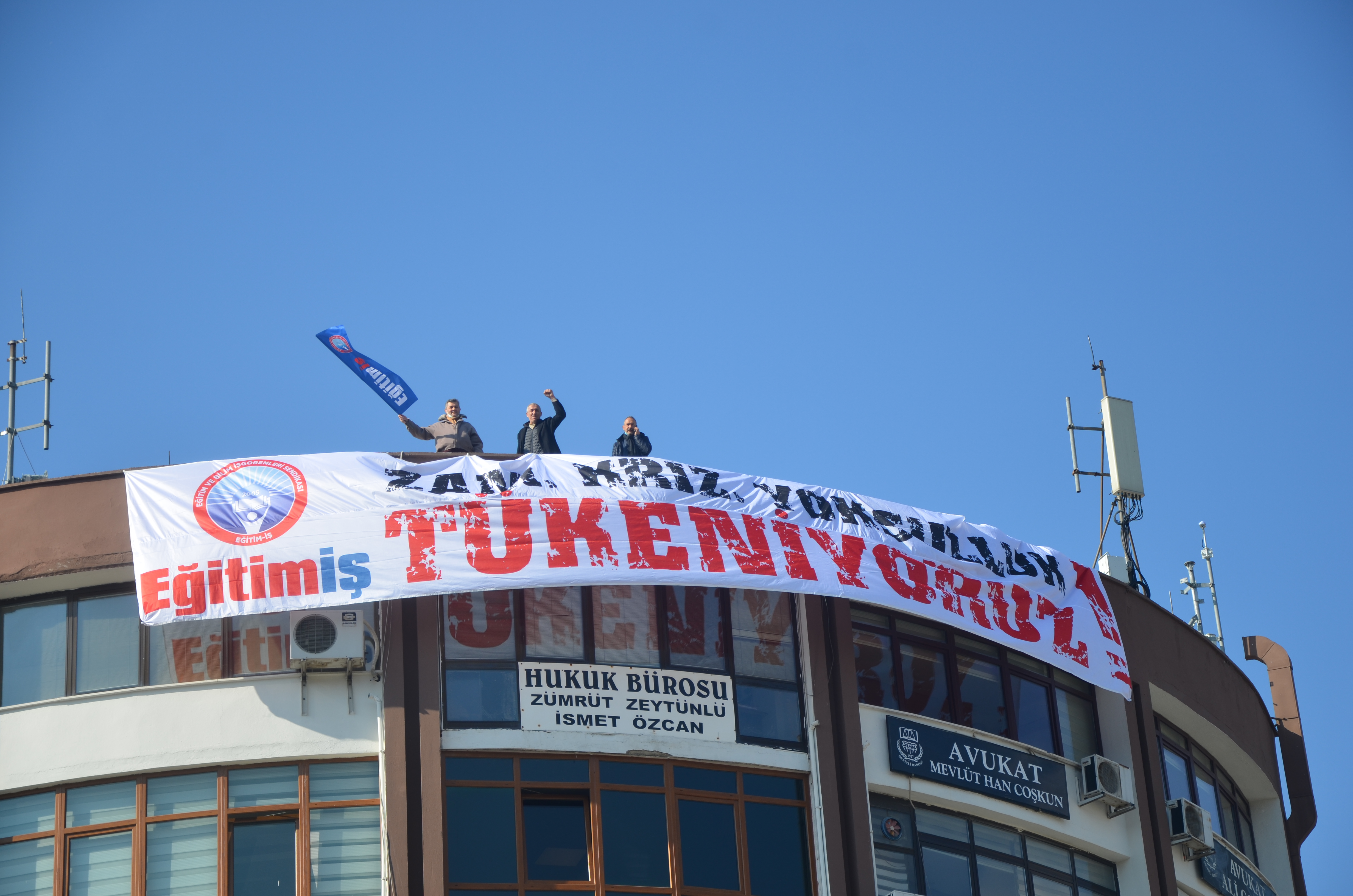 Eğitim-iş olarak öğrenci, veli, memur, öğretmen bütün emekçilerin hakkını korumak için buradayız, emekçilerimiz yalnız değildir. Onlar adına mücadele eden Eğitim-iş var. Susmuyoruz, korkmuyoruz, yılmıyoruz: Mücadele ediyoruz...