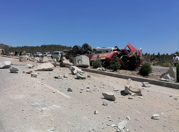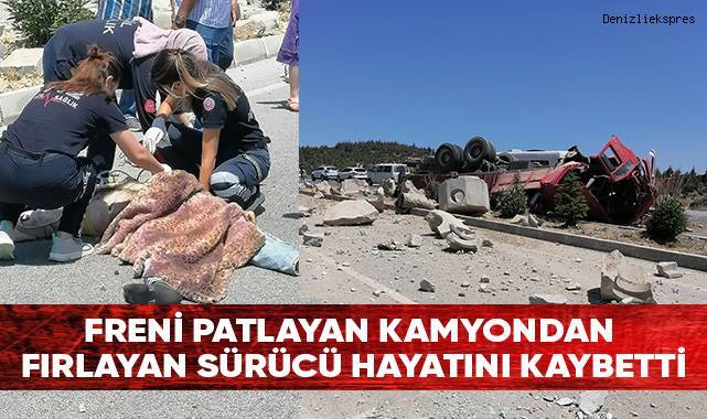 Denizli’nin Çivril ilçesinde yokuş aşağıya inerken freni patlayan kamyondan fırlayan sürücü hayatını kaybetti. Sürüklenerek karşı şeride geçen ve beton bariyerleri paramparça eden kamyonun, başka araçlara çarpmaması yaşanabilecek bir facianın önüne geçti.