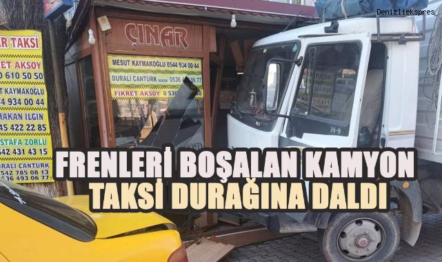 Olay Denizli’nin Buldan İlçesi Dörteylül Mahallesinde meydana geldi. Edinilen bilgilere göre, park halindeyken frenleri boşalan kamyon kendi kendine hareket etti. İçerisinde sürücüsünde de olamadığı kamyonet kontrolsüz şekilde hızlanmaya başladı. Karşı tarafta bulunan taksi durağına çarparak duran kamyon taksi durağına büyük hasar verdi. Taksi durağının içerisinde oturan taksi şoförünün olaydan yara almadan kurtulması kamyon sahibine ve durak sahibine teselli kaynağı oldu. ihbar üzerine bölgeye gelen polis ekipleri olayla ilgili incele yaptı.