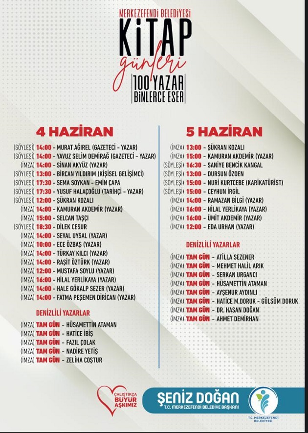 Merkezefendi Kültür Merkezi’nde, 4 Haziran Cumartesi günü saat 12.00’de Şükran Kozalı, saat 13.00’te Kişisel Gelişimci Bircan Yıldırım, saat 14.00’te Gazeteci Yazar Murat Ağırel ile Gazeteci Yazar Yavuz Selim Demirağ, saat 17.30’da Yazar Sema Soykan ile Gazeteci Emin Çapa, yine aynı saatte Tarihçi Yazar Yusuf Halaçoğlu ve saat 18.30’da Dilek Cesur gerçekleştirecekleri söyleşiler ile dinleyicileriyle bir araya gelecek.