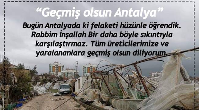 Bugün Antalya Kumluca Finike ve Demre ve Kaş ilçelerimizde şiddetli sağanak yağmur ve sonrasında oluşan hortumlar fırtına sonrası örtü altı sebzeciliği yapan üreticilerimizi ve çiftçilerimizin seraları zarar gördüğünü öğrenmiş bulunmaktayız.
