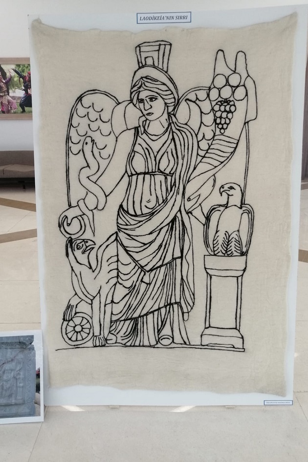 Geleneksel tepme keçe tekniği ile yapılan sergideki ürünler hakkında bilgi veren Öğr. Gör. Fatoş Neslihan Argun, "İncil de adı geçen yedi büyük kiliseden biri olan güney kilisesinin yer mozaiklerinin keçe üzerine işlenmesi sonucunda bu güzel eserler ortaya çıkmıştır. Sergide toplam yirmi bir eser yer almaktadır eserlerin içinde ise en dikkat çekici olan Laodikeia Antik Kentine ismi verilen kraliçe Laodikeia’nın keçe üzerine işlenmiş tasviri oldu."dedi.