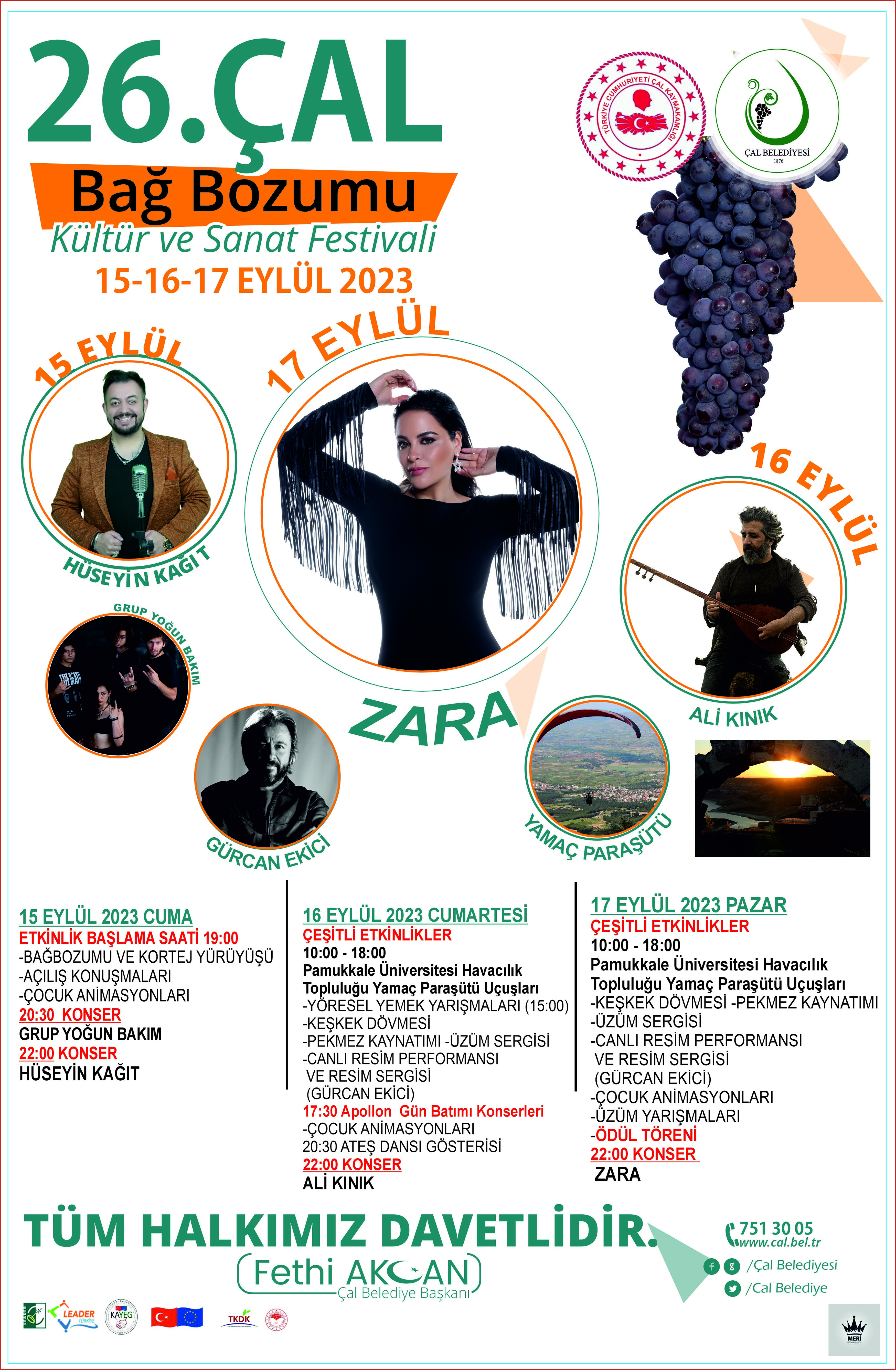 Bu yıl 26.’ncısı düzenlenecek olan Çal Bağbozumu Kültür ve Sanat Festivali üç gün sürecek. Festivalin zengin içeriği dikkat çekiyor. 15 Eylül Cuma günü kortej yürüyüşü ile start alacak olan festivalin ilk günü Grup Yoğun Bakım sahneye çıkacak, ardından Hüseyin Kağıt konser verecek. 16 Eylül Cumartesi günü Çökelez Dağı’ndan yamaç paraşütü uçuşları olacak. Yöresel Yemek Yarışması, yöresel keşkek dövmesi, pekmez kaynatımı, üzüm sergisi, canlı resim performansı etkinlikleri düzenlenecek. Ressam Gürcan Ekici’nin resim sergisi açılacak. Günbatımı Konserleri’nin ardından festival alanında Ateş Dans Gösterileri yapılacak ve Ali Kınık konseri ile festivalin ikinci günü tamamlanacak. 17 Eylül Pazar günü sabah saatlerinde yamaç paraşütü uçuşları ve gösterileri düzenlenecek. Çeşitli etkinlikler ve kültürel aktivitelerin ardından “En iyi üzüm yetiştiricileri” yarışmayla belli olacak. Ödül törenlerinin ardından ünlü sanatçı Zara sahne alacak ve festival sona erecek.